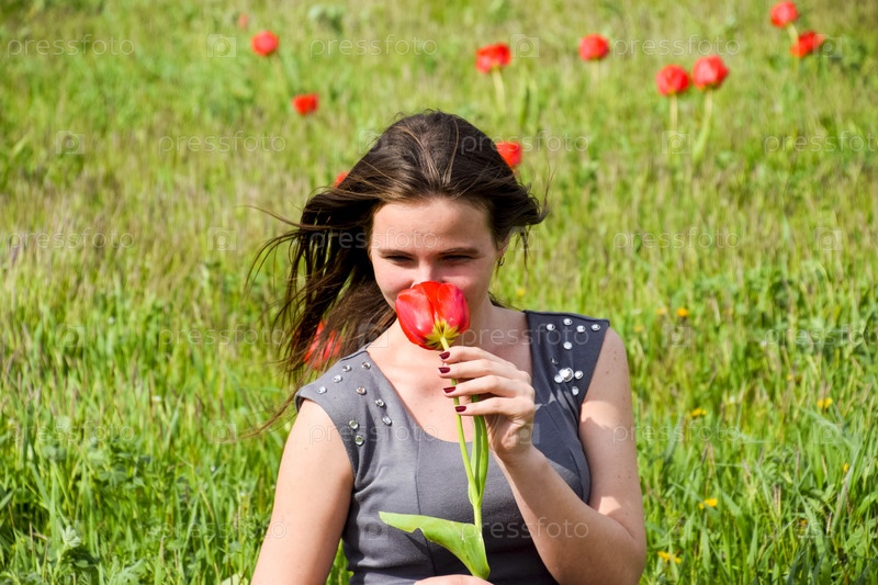 Красивая фея маленькая девочка в поле среди цветов тюльпана