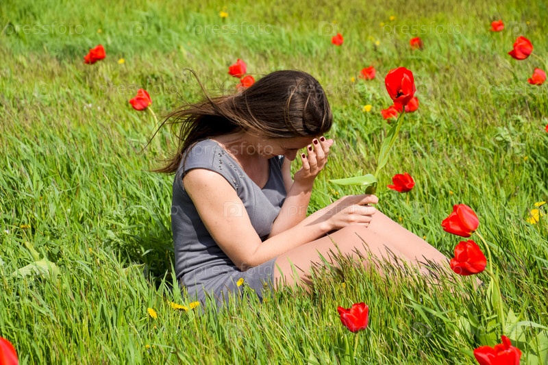 Красивая девушка в поле среди цветов тюльпана
