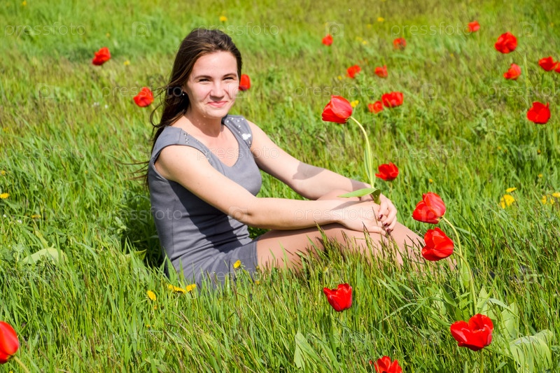 Красивая девушка в поле среди цветов тюльпана