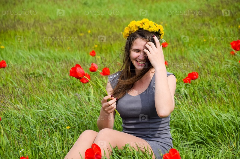 Красивая фея маленькая девочка в поле среди цветов тюльпана