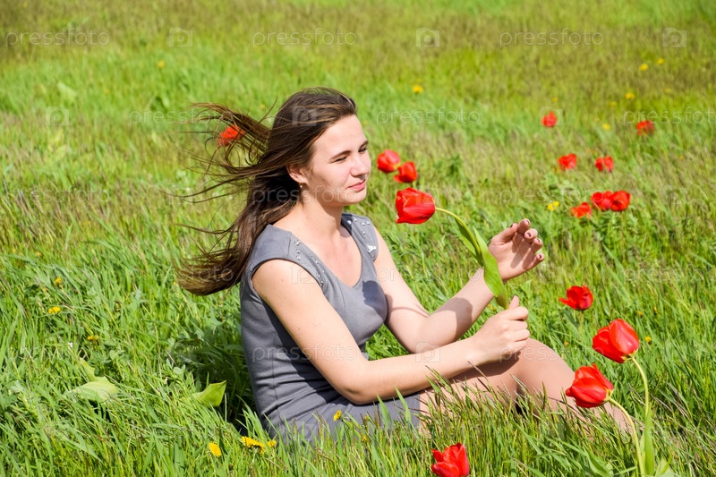 Красивая фея маленькая девочка в поле среди цветов тюльпана