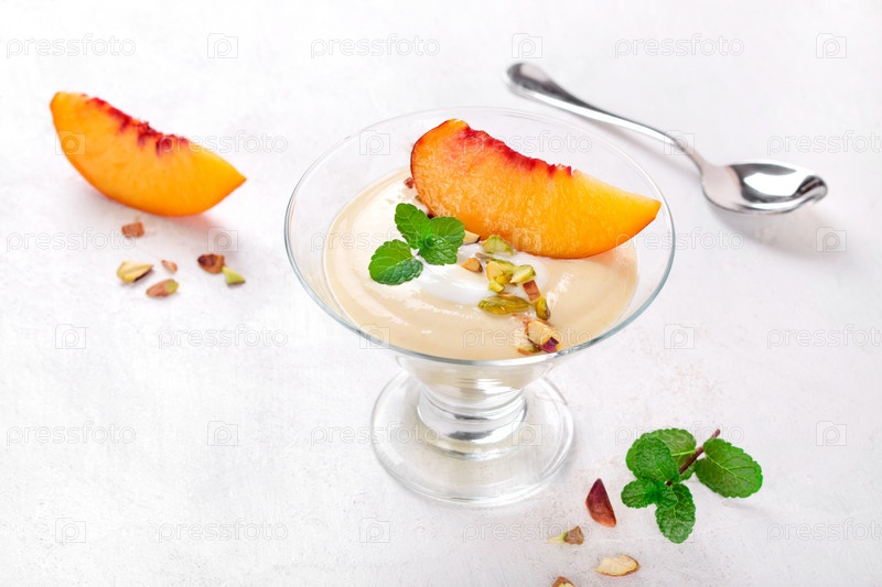 Йогуртовый десерт с ломтиком нектарина и фисташками в стеклянной миске на белом столе