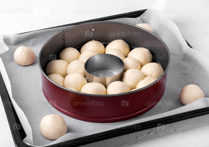 Расстойка обезьяньего хлеба, состоящего из шариков из дрожжевого теста, перед выпечкой на кольцевой сковороде