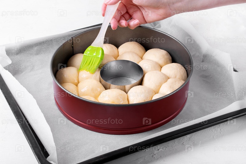 Приготовление обезьяньего хлеба, состоящего из шариков из дрожжевого теста и смазанных яйцом, перед выпечкой на кольцевой сковороде