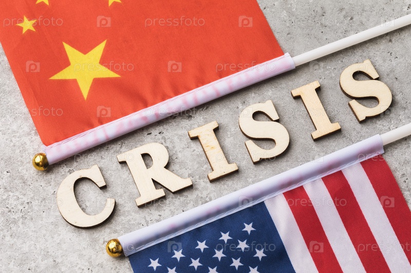 Текст из деревянных букв и двух флагов, концепция кризиса в отношениях между Китаем и Америкой