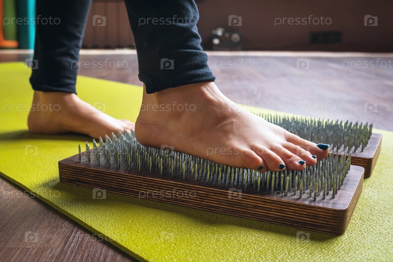Женщина, практикующая йогу, ступает на доску садху с гвоздями, концепция на тему здорового образа жизни