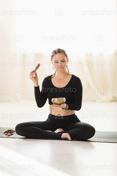 Женщина, практикующая йогу, занимающаяся звуковой медитацией с поющей чашей, сидящая в позе лотоса на коврике в комнате