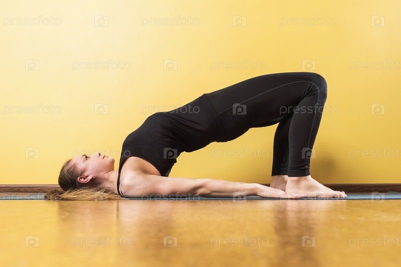 Женщина, ведущая здоровый образ жизни и практикующая йогу, выполняет упражнение дви пада питасана, поза полумоста, тренируется в спортивной одежде в комнате, лежащей на коврике у стены