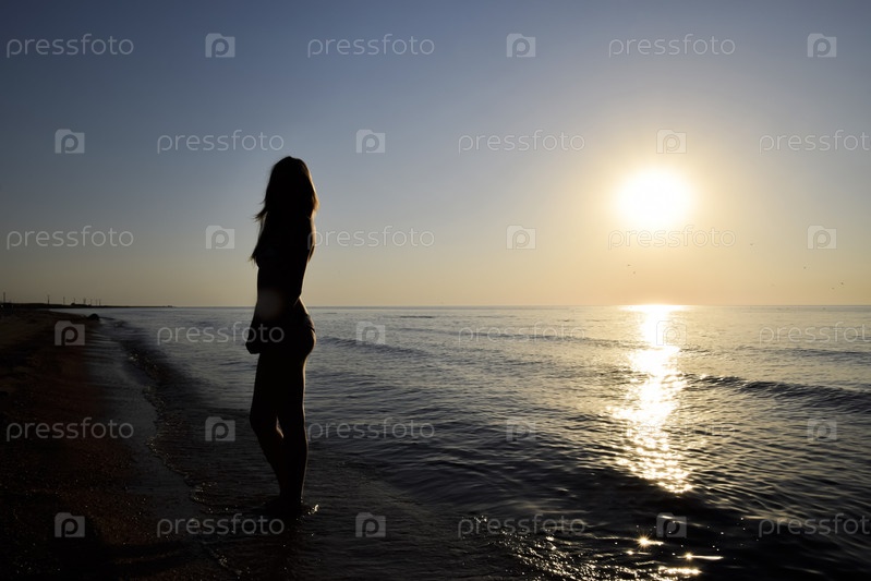 Силуэт девушки на фоне заката у моря