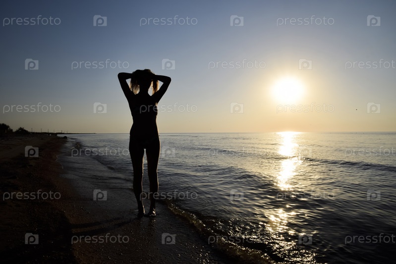 Силуэт девушки на фоне заката у моря