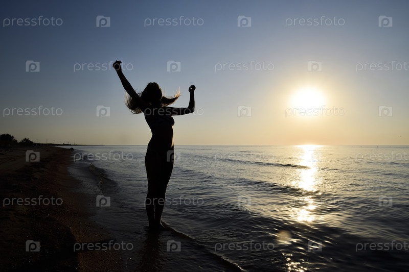 Силуэт девушки на фоне заката у моря