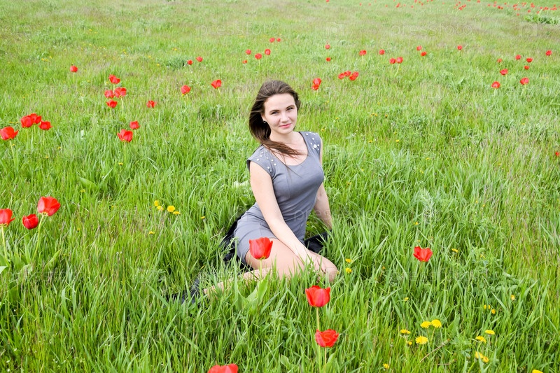 Красивая фея маленькая девочка в поле среди цветов тюльпана