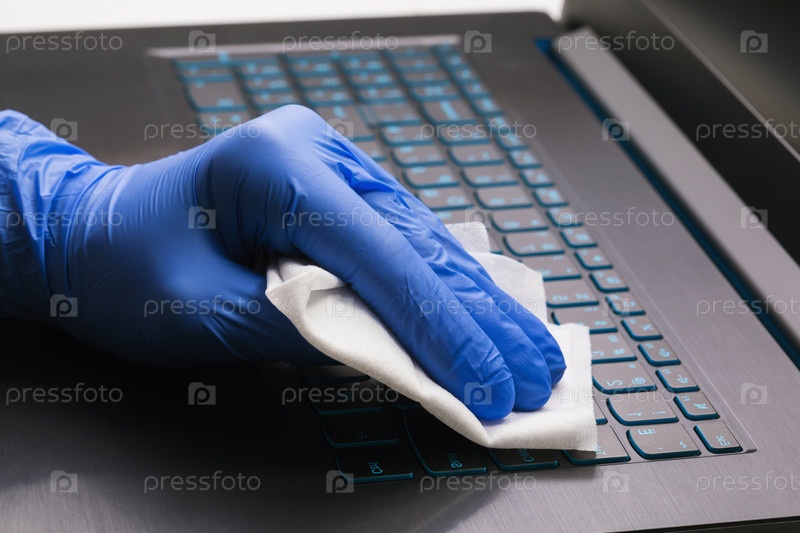 Мужская рука в синей перчатке очищает клавиатуру ноутбука антибактериальным средством для защиты от эпидемии COVID-19