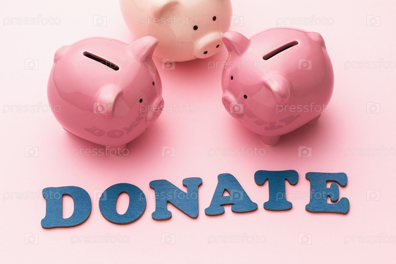 Слово из деревянных букв и три копилки на розовом фоне, концепция на тему пожертвования денег