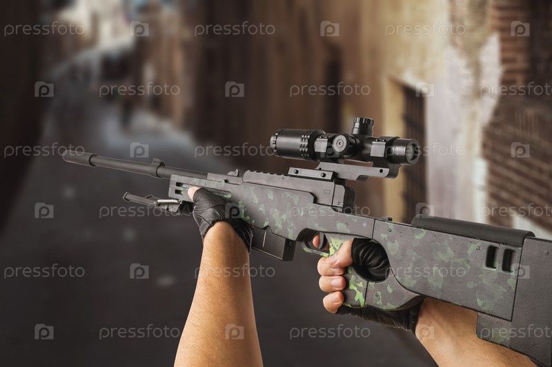 Детская игрушечная снайперская винтовка из дерева в руках, крупным планом