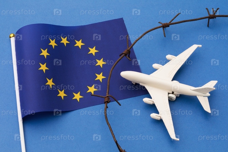 Флаг ЕС, колючая проволока и игрушечный самолет на синем фоне, концепция закрытой воздушной границы Европейского союза