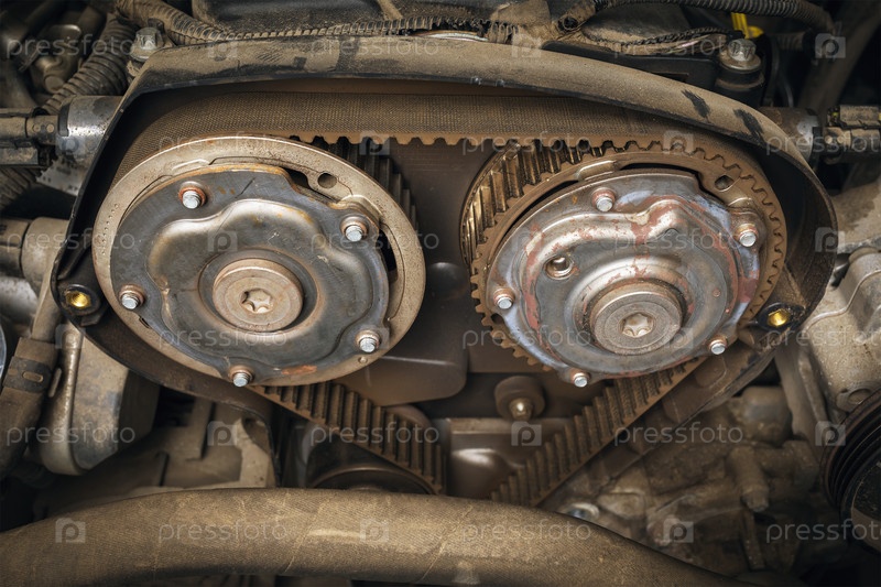 Открытый кузов со старым ремнем ГРМ легкового автомобиля, крупный план