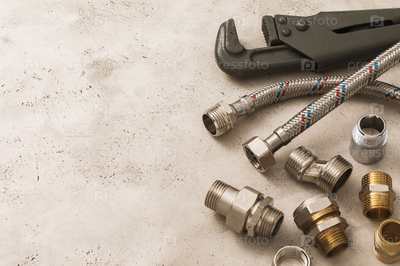 Разводной гаечный ключ, гибкие водяные шланги и соединительные адаптеры с правой стороны абстрактного фона с копией пространства