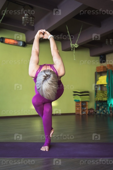 Женщина, практикующая йогу, выполняет вариацию упражнения гарудасана, поза орла с заведенными за спину руками, стоит на коврике в комнате