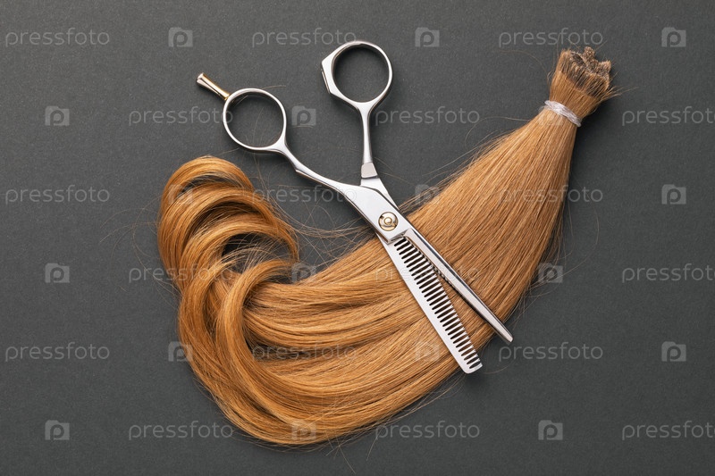 Ножницы и отрезанная прядь детских светлых волос на темном фоне бумаги, вид сверху