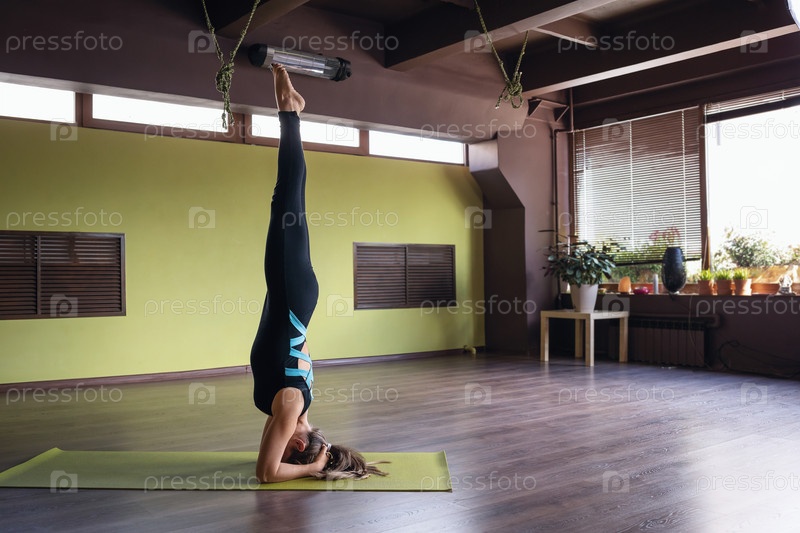 Женщина занимается йогой, делает упражнения ширшасана, переворачивает асану, тренируется в спортивной одежде на коврике в студии, занимается укреплением тела