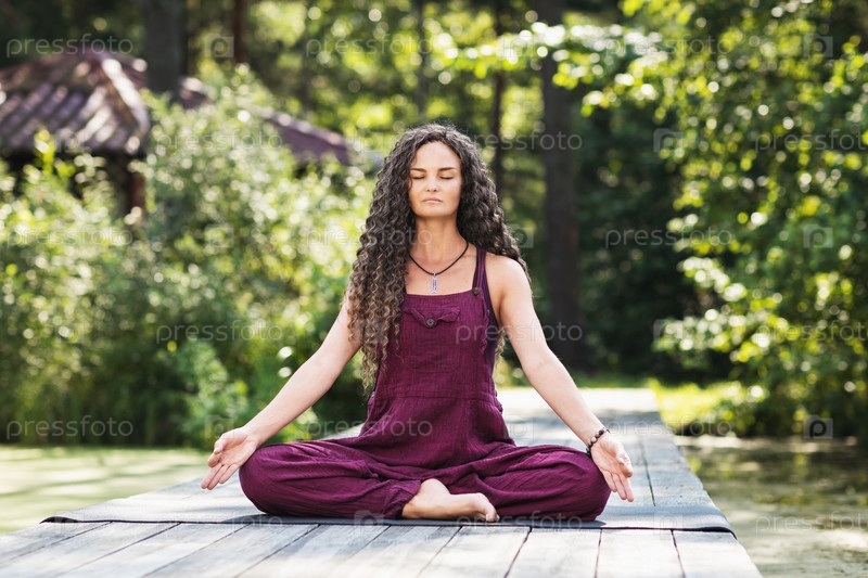 Женщина, ведущая здоровый образ жизни и практикующая йогу, медитирует с закрытыми глазами, сидя в позе лотоса на деревянном мосту, на берегу пруда в парке