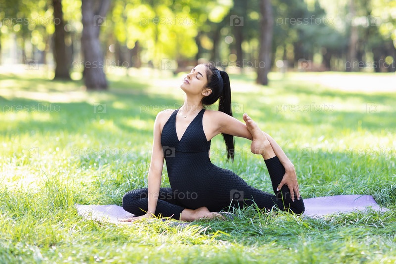 Молодая беременная женщина, практикующая йогу, выполняющая упражнение в позе голубя Эка Пада Раджакапотасана, тренирующаяся в спортивном комбинезоне черного цвета, сидящая на коврике в парке летним утром