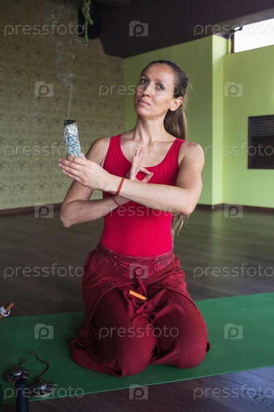 Портрет женщины, ведущей здоровый образ жизни и практикующей йогу, занимающейся медитацией с благовониями, сидящей на коврике в студии