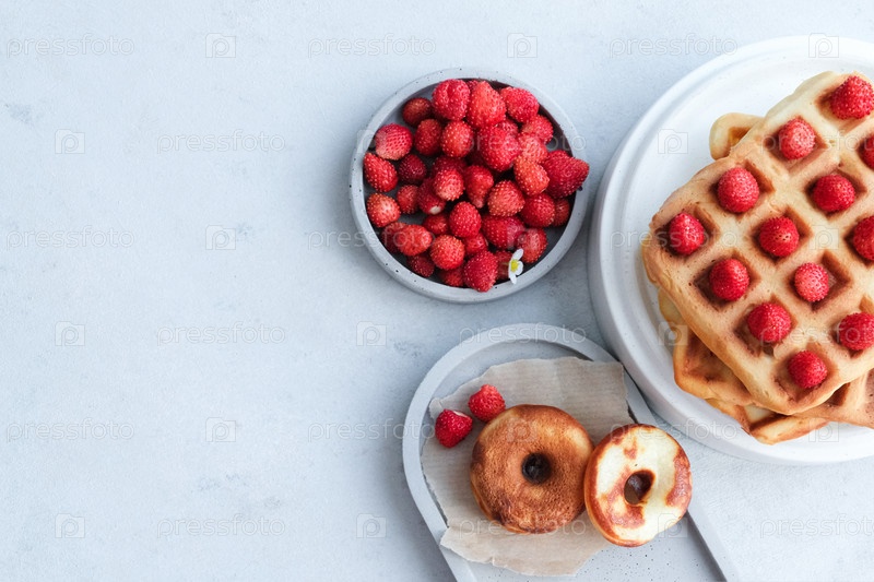 Бельгийские или венские вафли с клубникой на минималистичном бетонно-сером фоне. вкусное сладкое блюдо, десертная закуска, концепция меню. скопируйте место для текста