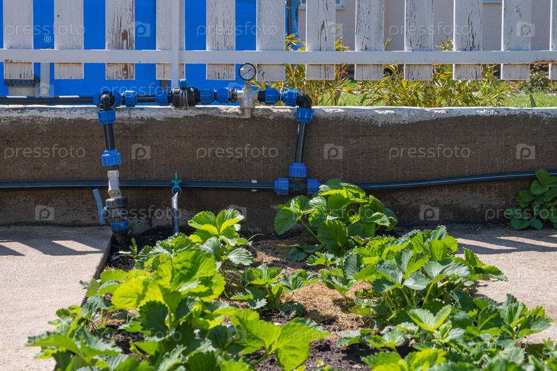 Растение клубники, выращенное на грядках с системой автоматического полива или капельного полива в домашнем огороде. Шланг для полива и орошения