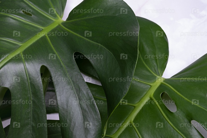 Растение монстра на фоне серого мрамора. концепция минимализма. Monstera deliciosa или швейцарский сырный завод тропические листья фон