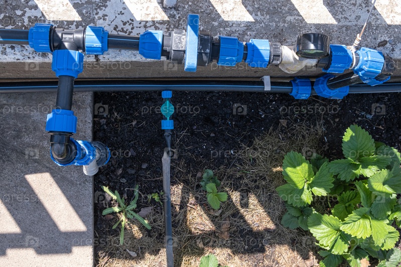 Растение клубники, выращенное на грядках с системой автоматического полива или капельного полива в домашнем огороде. Шланг для полива и орошения