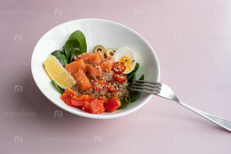 Тарелка с тыквой блюдо. свежий лосось, лебеда, шпинат, лимон для здорового питания. копировать пространство