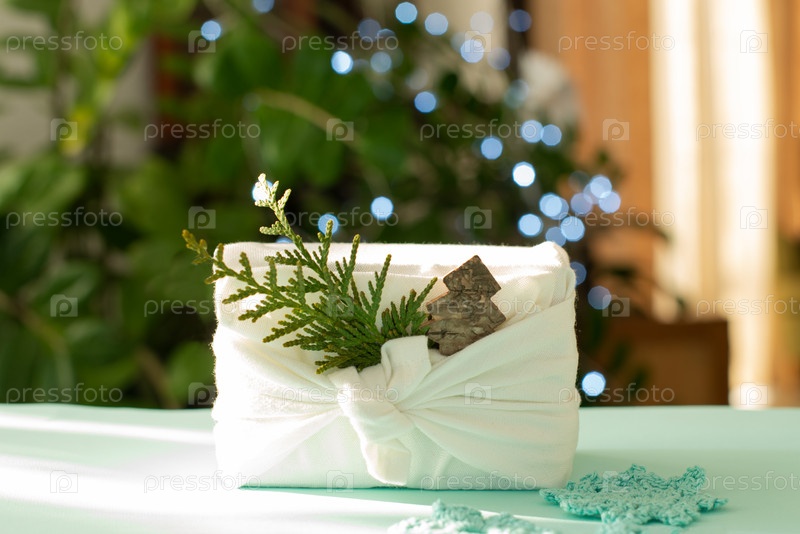 Рождественский подарок. Упаковка из экологически чистых материалов, ткань фурошики. Боке