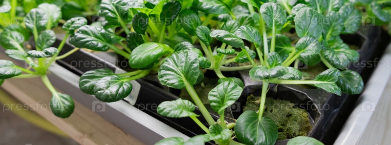 Капуста тацой. Городская микрозеленая ферма. Экологичный малый бизнес. Детские листья, фитолампа