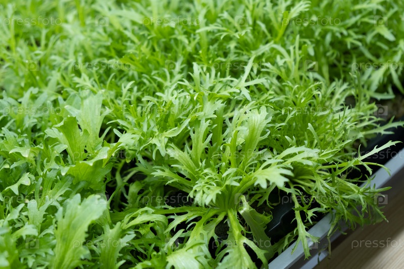 Зеленые листья салата эденвия, выращенные на микроферме агропонным методом