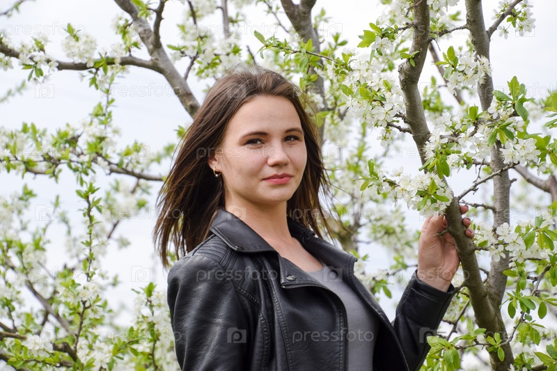 Красивая фея молодая девушка в цветущем сливовом саду. Портрет