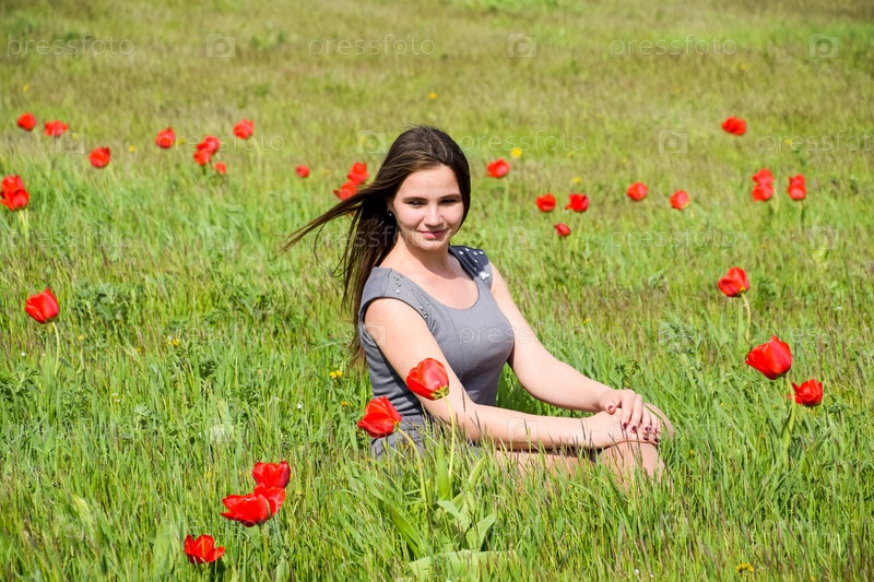Красивая девушка в поле среди цветов тюльпана