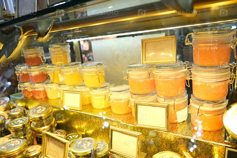 Москва, Россия, 2021. Красная икра в стеклянных банках на витрине рыбного магазина