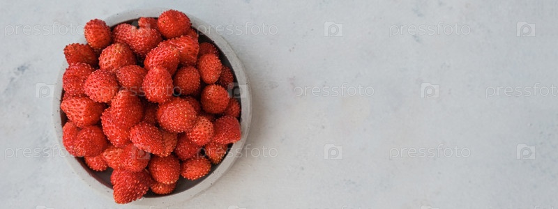 Баннер. Красные ягоды земляники на сером бетонном фоне. Концепция лета в минимализме