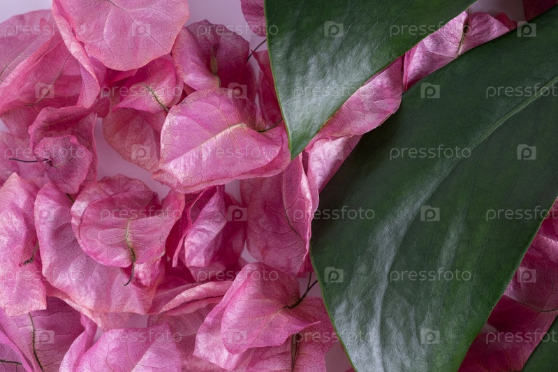 Лист монстера с бугенвилией, сухие розовые цветы, фон для эко-продукции, косметика