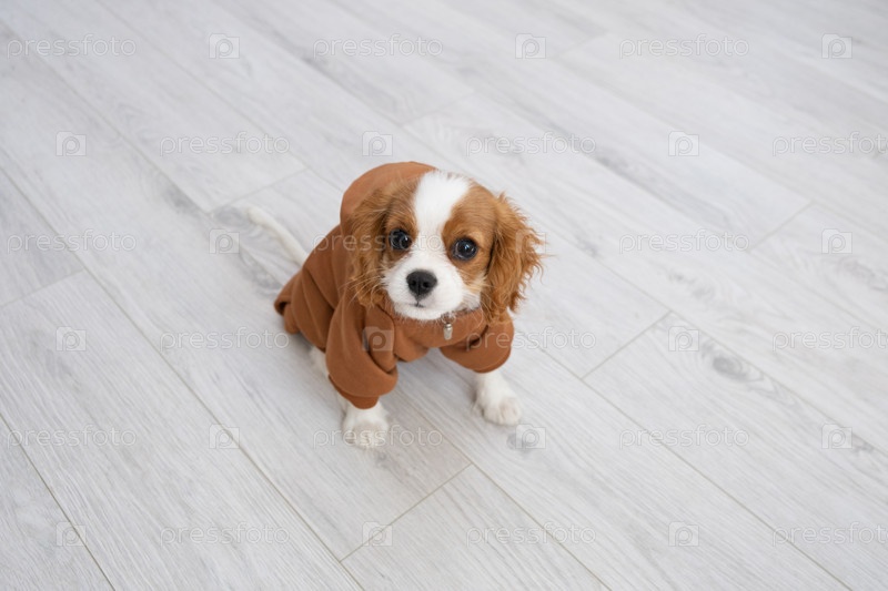 Портрет крупным планом милого щенка в коричневой толстовке с капюшоном. Осенняя и зимняя одежда для домашних животных. Кавалер-кинг-чарльз-спаниель Бленхейм