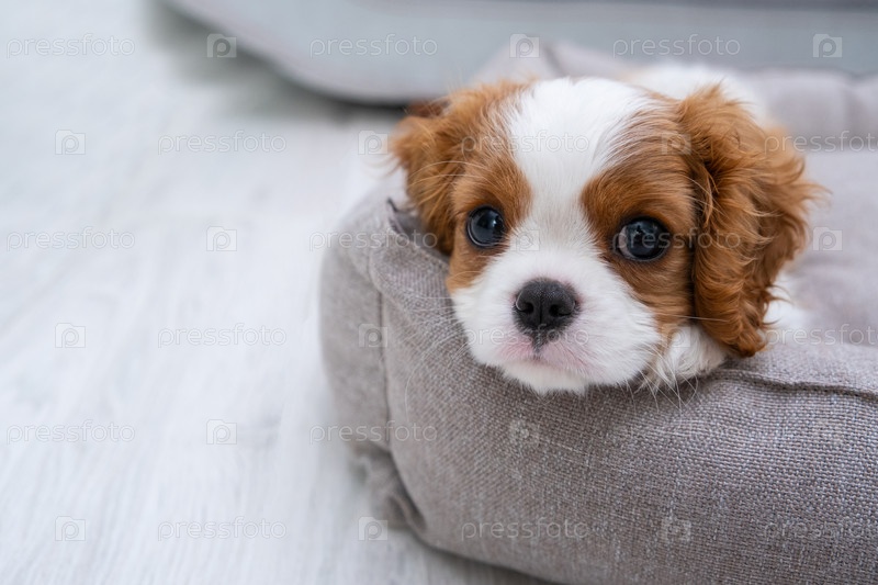 Крупным планом портрет милого щенка Бленхейм Кинг Чарльз Спаниель в домашней обстановке с пространством для текста. Маленькая собака лежит на сером фоне