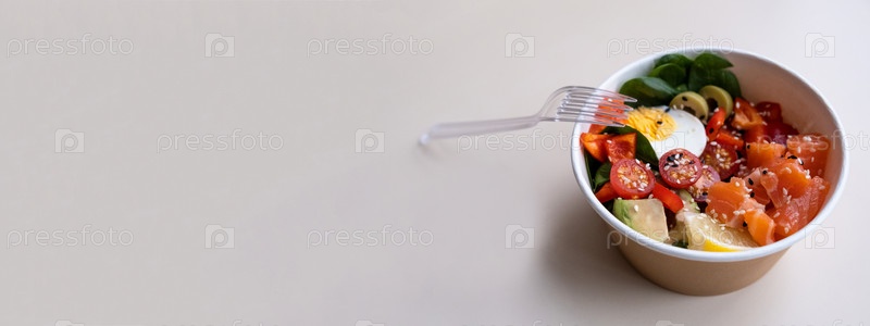 Баннер. Поке боул со свежим лососем; авокадо; Лебеда. Еда на вынос Здоровая модная фитнес-питание. в переработанной круглой коробке с устойчивой вилкой; концепция еды на вынос