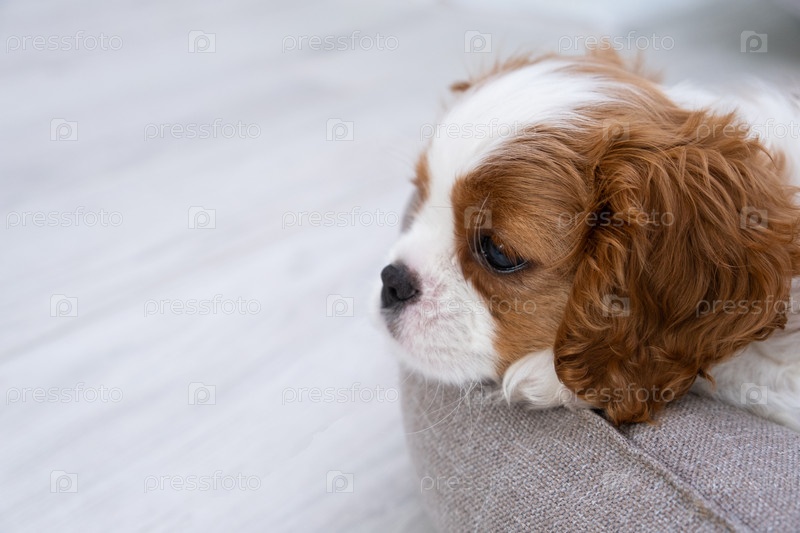 Крупным планом портрет милого щенка Бленхейм Кинг Чарльз Спаниель в домашней обстановке с пространством для текста. Маленькая собака лежит на сером фоне