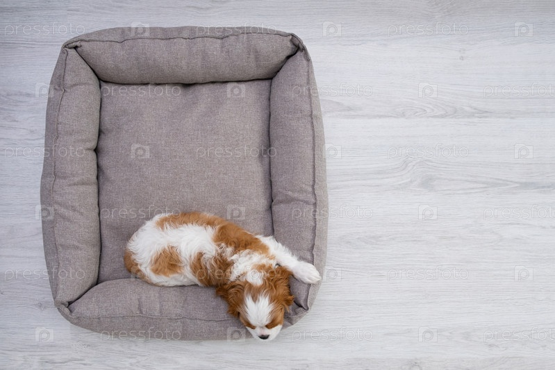 Крупным планом портрет милого щенка Бленхейм Кинг Чарльз Спаниель в домашней обстановке с пространством для текста. Маленькая собака лежит на сером фоне