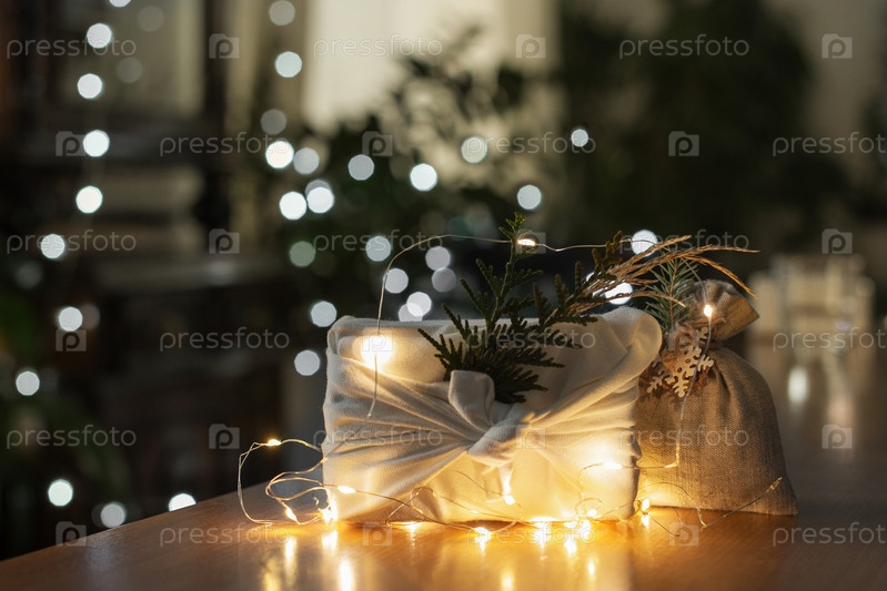 Рождественский подарок. Упаковка из экологически чистых материалов, ткань фурошики. Боке, выборочный фокус