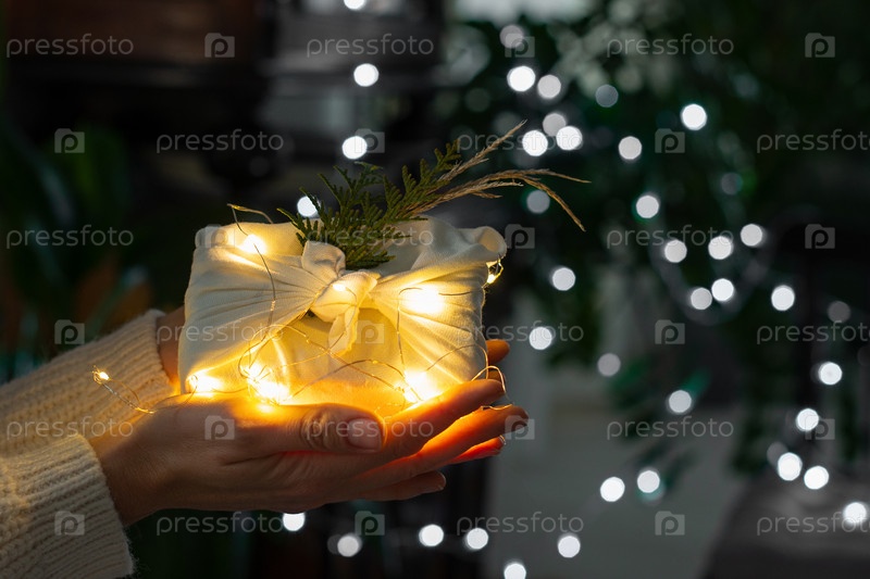 Рождественский подарок. Упаковка из экологически чистых материалов, ткань фурошики. Боке, выборочный фокус