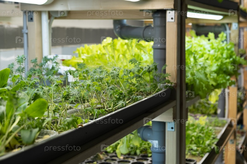 Зеленые листья салата эденвия, выращенные на микроферме агропонным методом