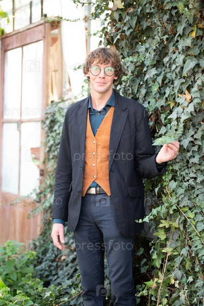 Мужчина в модной одежде и очках позирует возле кирпичной стены
